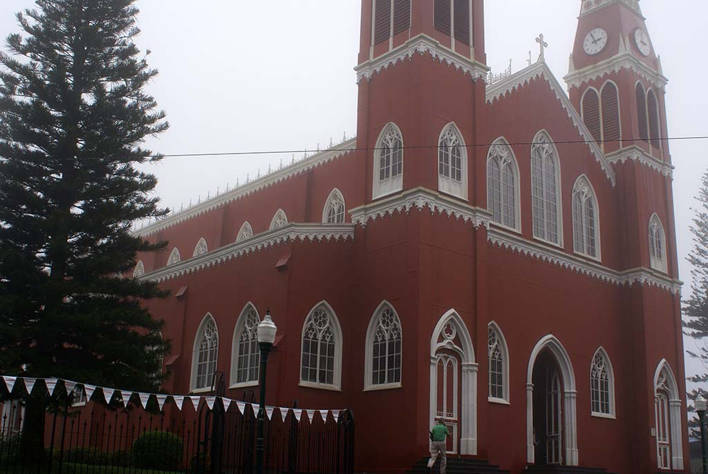 After lunch, we drove to Grecia where the metal church resides. The story goes, there was an earthquake in 1888 which destroyed the town’s center and church. The towns’ people all chipped in to purchase the new material that was supposed to be earthquake proof. The material was iron and was in Belguim. It took 2 years for all the iron pieces of the church to be shipped, transported and in ox carts to get to Grecia. In the main square the community was sick of it and let it set in the elements of the outdoors for several years. A new mayor came to town and financed the church to be finally built. It is red and from afar looks like stucco. The inside has stained glass arched windows. The pews are lined with floral arrangements.