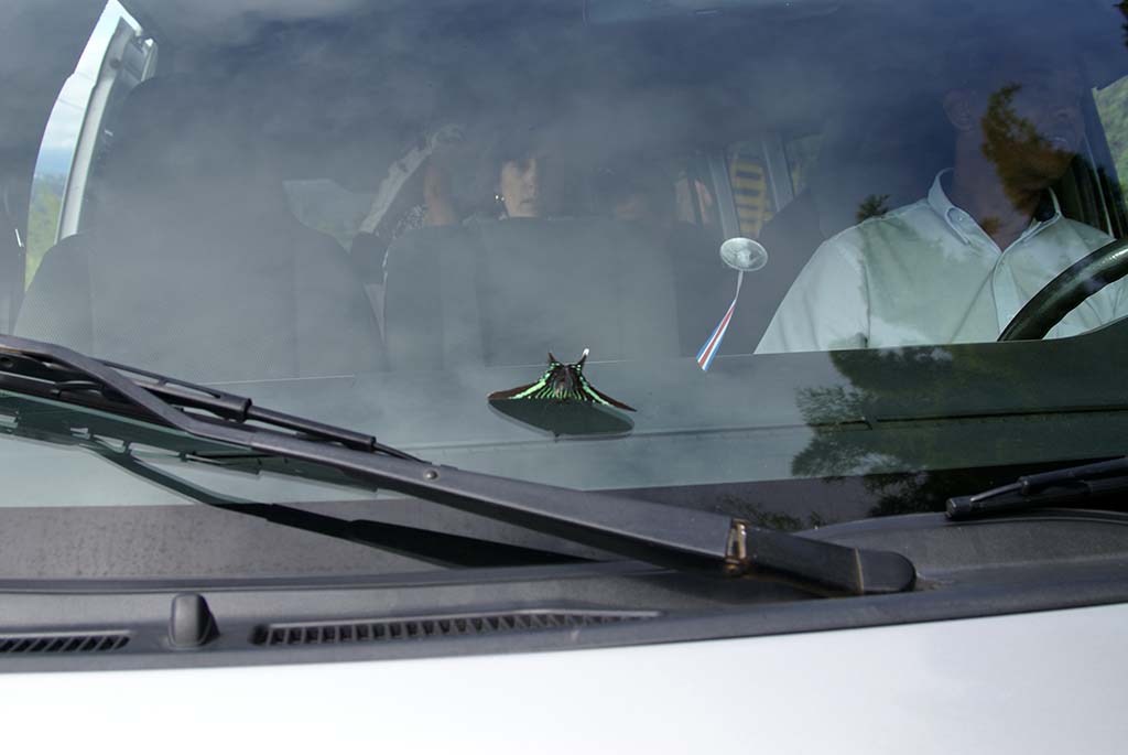 has been fun. The driver slows down for photo opportunities. He even slowed down for us to see a monkey crossing the road and a butterfly, beautiful blue with black.