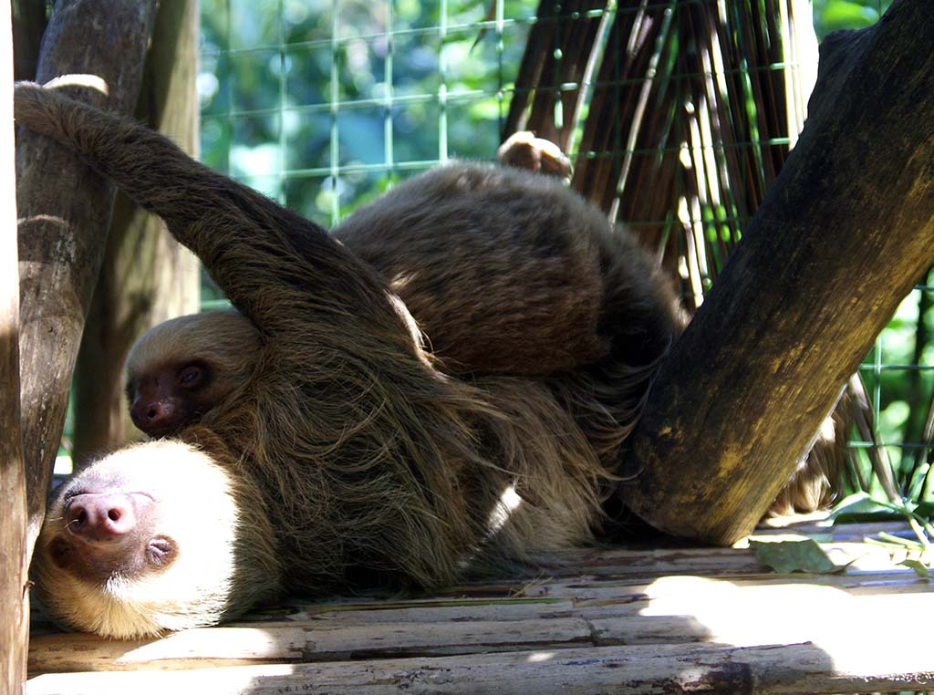 Mornings and afternoons we feed the animals. Three spider monkeys, one Capuchin monkey(Benjamin), 1 Kinkajou monkey, one Scarlet macaw, many parrots and 2 two-toed sloths! One (Milagro) had her arm amputated from being electrocuted. She has a baby which they plan on releasing.